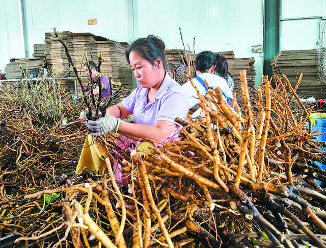 工作人员手持高压水枪,仔细冲洗牡丹种苗根部的泥土;旁边,多名工人围坐在一起,用剪刀精准修剪种苗枝叶;一侧,几名工人则将加工完毕的牡丹种苗小心装入包装箱。“我们目前加工的这批牡丹种苗共1万余棵,即将出口韩国。”菏泽牡丹商会会长吴勇华介绍道。