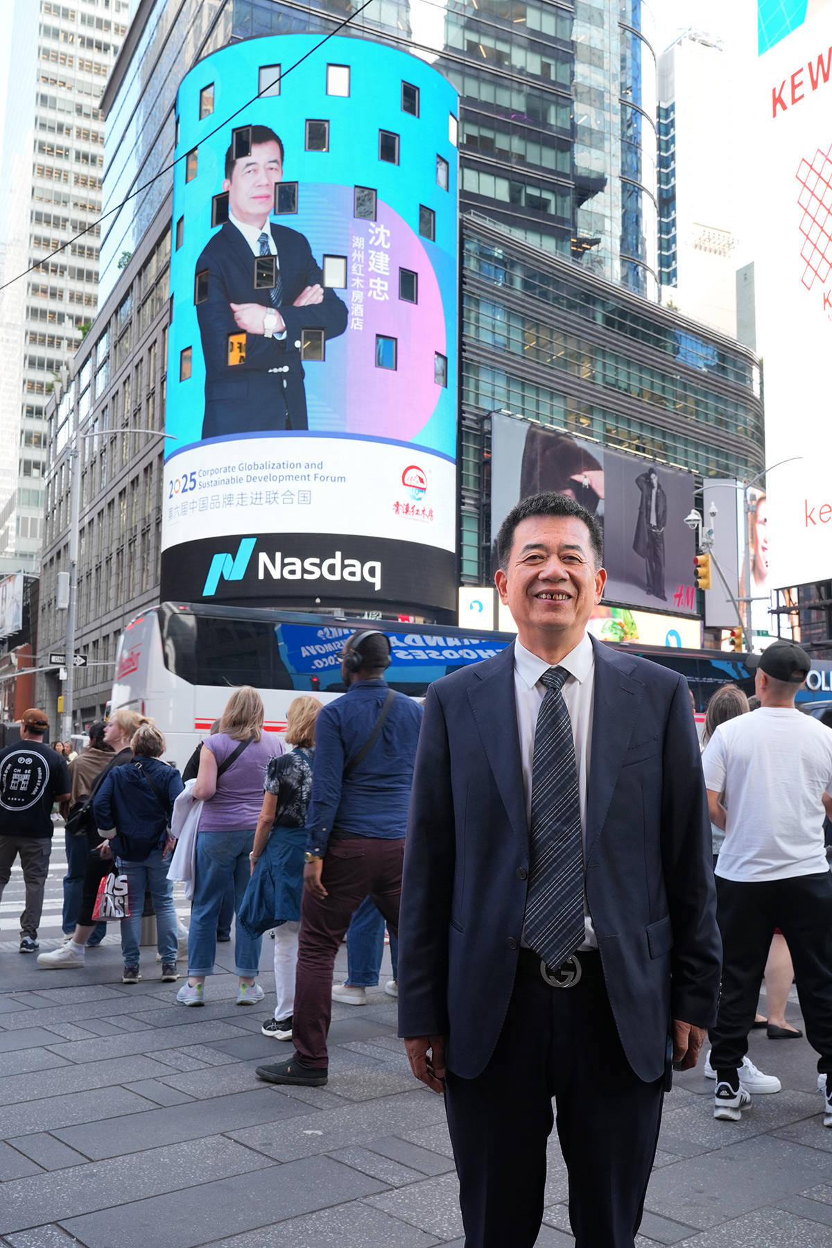 论坛当日,沈建忠同其他中国企业代表一同来到纽约时代广场,此刻,其个人形象登上纳斯达克大屏,向全球进行形象展播,此次亮相,不仅展现了中国企业家走向世界的自信与从容,更向全球资本市场发出了湖州红木房酒店管理有限公司品牌的强音。