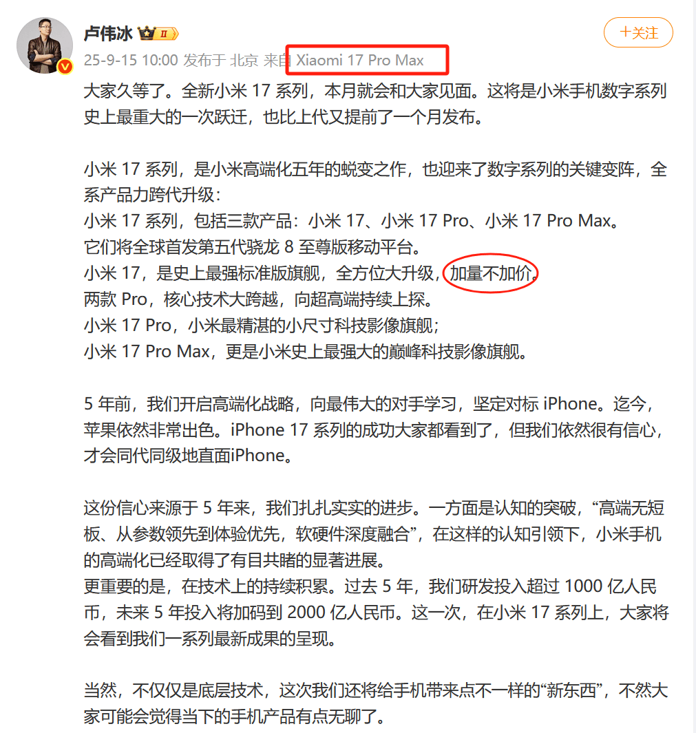 最关键的是,从卢伟冰官宣声明中的加量不加价可以得知。要是小米 17 系列标准版还是 4499 元起的话,那么苹果可就危险了。所以小雷觉得,选小米 17 还是选 iPhone 17,将会是九月手机圈谁也绕不开的热门话题。